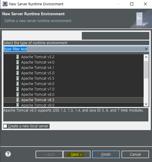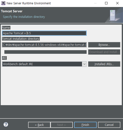 4️⃣ Tomcat installation directory에서 톰캣이 있는 폴더를 경로로 설정 > Finish