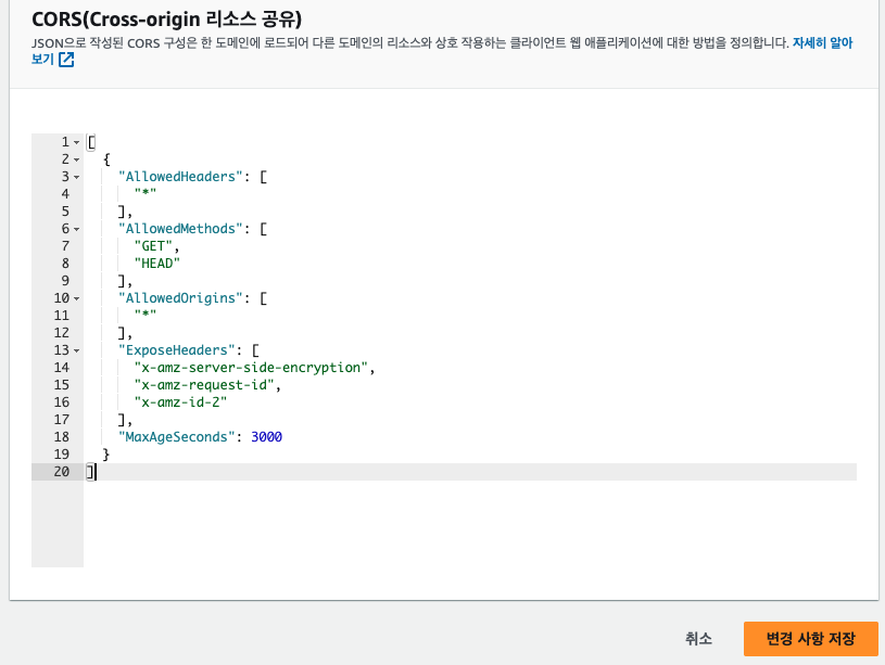참고 자료 : https://docs.aws.amazon.com/ko_kr/sdk-for-javascript/v2/developer-guide/cors.html